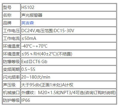 三、HS102防爆型小聲光報警器技術(shù)參數(shù)