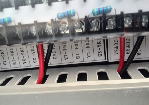 輸出模塊的音源線(AC120V)嚴禁與二總線(DC28V)混接,會造成設備燒損。