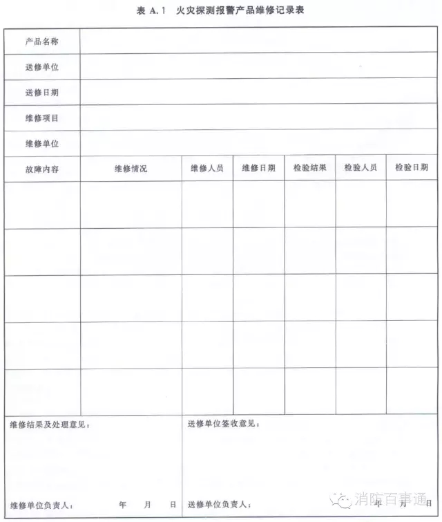 附錄A火災探測報警產(chǎn)品維修記錄表