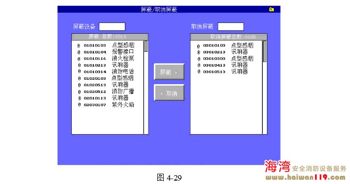 當(dāng)外部設(shè)備(探測(cè)器、模塊或火災(zāi)顯示盤)發(fā)生故障時(shí),可將它屏蔽掉,待修理或更換后,再利用取消屏蔽功能將設(shè)備恢復(fù)。